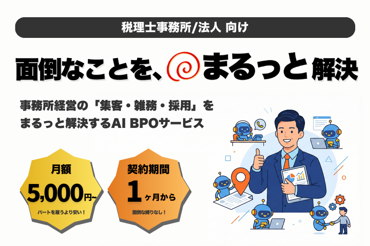 まるっとは、税理士業務を進める上で欠かすことのできない集客・雑務・採用をAIとプロ人材で支援します。